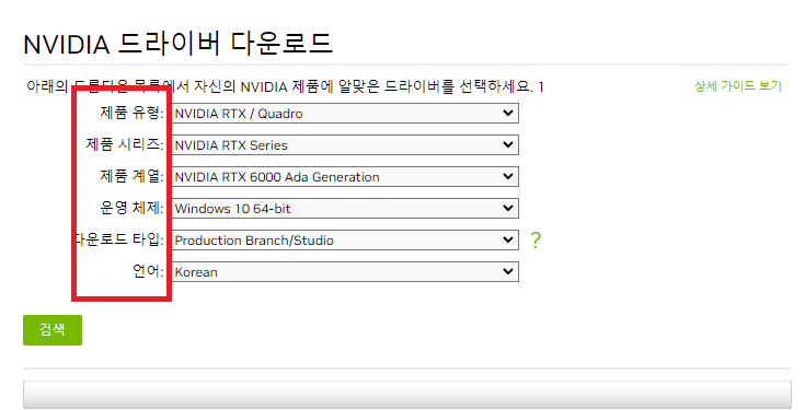 2)자신의 그래픽 카드의 제품을 확인 한 뒤, 유형부터 언어까지 자신이 맞는 모델을 선정 하고 검색 버튼을 누릅니다.