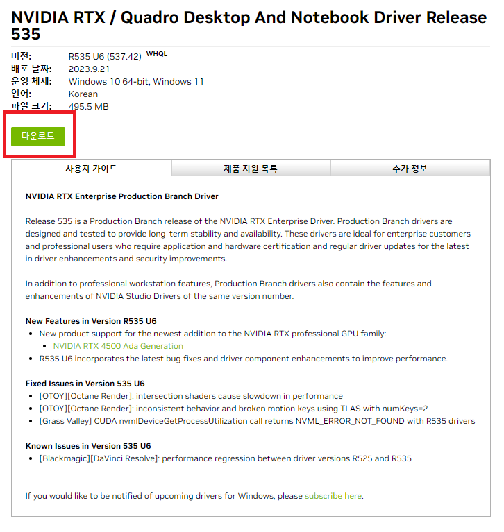 3)윈도우 운영 체제가 몇인지 확인 하고 해당 그래픽 카드 모델과 일치 할 경우 다운로드 버튼을 누릅니다.