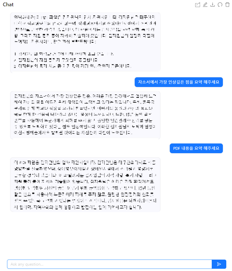 자소서PDF를 넣어보니 Chat GPT 같이 채팅 창이 나옵니다. 여기서 이용자는 PDF에 나오는 내용을 토대로 질문을 하면 AI가 자동으로 답변을 해주게 됩니다.(모자이크를 한 이유는 개인정보다보니 모자이크를 넣었음)