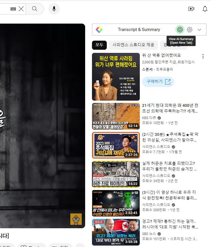 4)유튜브를 접속 합니다. 그럼 오른쪽에 처음보는 버튼이 있을 겁니다. 방금 확장자를 다운 받았기 때문에 생긴 버튼인데요 여기서 챗 GPT 로고가 그려져 있는 버튼을 눌러봅니다.