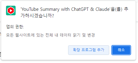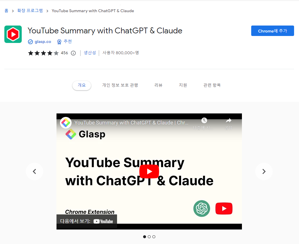 2) YouTube Summary with ChatGPT 오른쪽에 있는 ‘ chrome에 추가’ 버튼을 누릅니다.