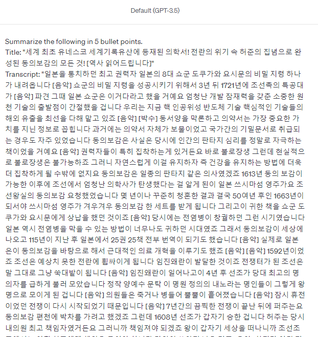 5) 요약된 유튜브 내용이 챗 GPT를 통해 나옵니다. 여기서 아래를 잘 보면 이 내용을 요약해서 AI가 설명을 추가로 해줍니다.